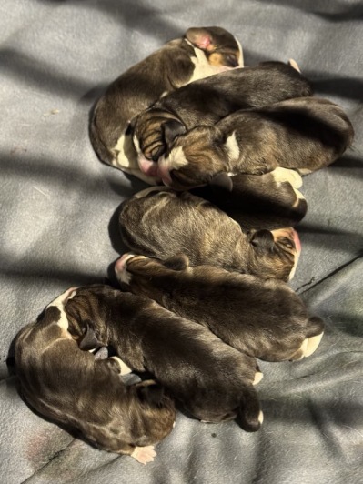 Deretter kom det en trefarget tispe på 330 gram som kom med beina først.Deretter gikk det jevnt og trutt. Det kom 4 tisper til og en hannhund. Totalt ble det 8 valper fordelt på 6 tisper og 2 hannhunder- alle tricolor med pene tegninger. Jeg er ikke bortskjemt med store valper- normalt ligger de rundt 200-250 gram, men her var den minste valpen 320 gram og den største var 380 gram.