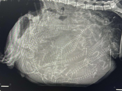 I dag har vi tatt turen til veterinær Eli for å ta røntgen av Anna. Dess større tispene er, jo vanskeligere er det å få et nøyaktig antall valper. Det vi så på bildene var at det garantert er 7 valper, men etter å ha studert bildene nøye mener vi at det er en ekstra valp. Så vil fremtiden vise om det er 7 eller 8 valper