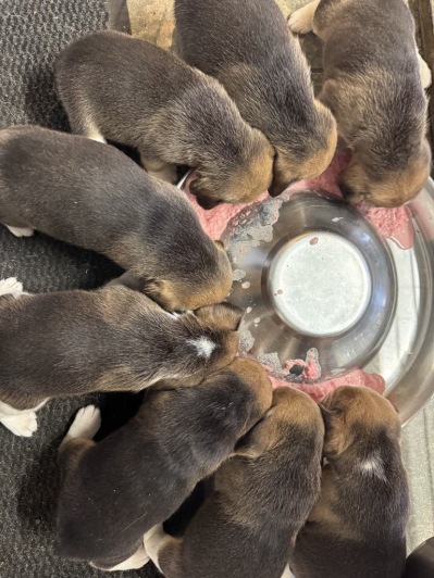 Denne uken har det skjedd mye på aktivietsfronten. Valpene har fått sitt første måltid med fast føde og det falt virkelig i smak. De ELSKET maten og var så flinke til å spise. De har også fått seg flere turer ut i fin været- og man ser utvikling fra dag til dag. Nå løper de rundt på plenen og koser seg virkelig. Batteritiden på dem er fortsatt ikke mye å skryte av- så det blir gjerne full rulle og så felles siesta. Til helgen får de en ny runde med kur mot innvollsparasitter og klipp av negler.